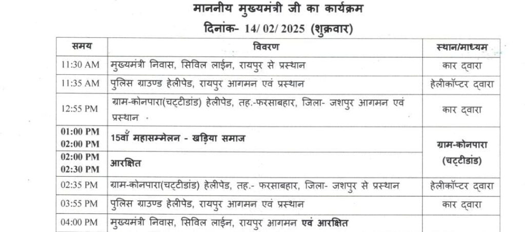Tomorrow’s Schedule of HCM February 14, 2025February 14, 2025Roytars News रायपुर 14 फरवरी। Tomorrow’s Schedule of HCM