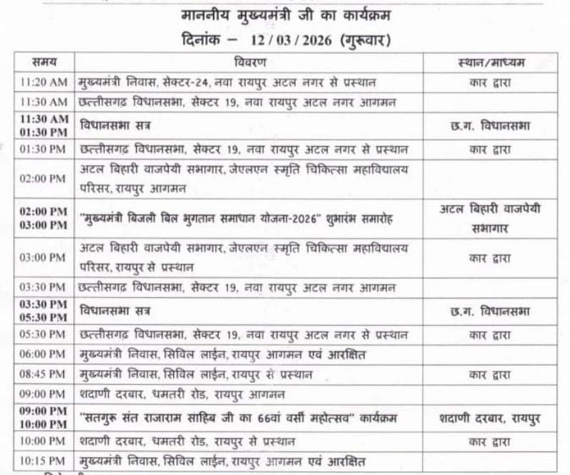 Today’s Schedule of HCM March 12, 2026March 12, 2026Roytars News Raipur 12 March. Today’s Schedule of HCM.