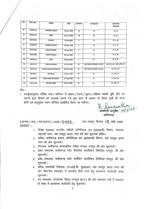 अधिकारियों ने बताया कि आबकारी आरक्षक पद हेतु छत्तीसगढ़ व्यापम द्वारा आयोजित भर्ती परीक्षा में व्यापम द्वारा जारी मेरिट सूची के आधार पर विभाग में दस्तावेज सत्यापन एवं शारीरिक