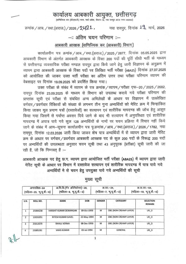 रायपुर, 19 मार्च 2026/ आबकारी विभाग के अंतर्गत आबकारी आरक्षक के रिक्त 200 पदों की पूर्ति हेतु सीधी भर्ती के माध्यम से छत्तीसगढ़ व्यवसायिक परीक्षा मण्डल रायपुर (व्यापम) द्वारा 27
