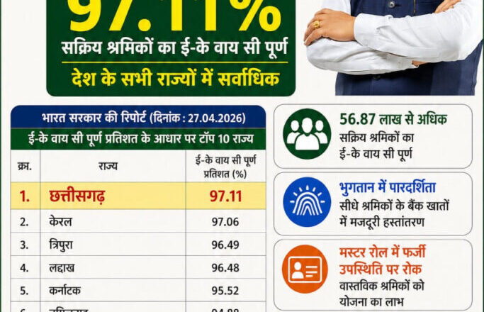 रायपुर, 27 अप्रैल 2026 : महात्मा गांधी राष्ट्रीय ग्रामीण रोजगार गारंटी योजना (मनरेगा) के अंतर्गत श्रमिकों के ई-के वाय सी कार्य में छत्तीसगढ़ ने पूरे देश में प्रथम स्थान प्राप्त कर उल्लेखनीय उपलब्धि हासिल की है। भारत सरकार द्वारा जारी ताजा रिपोर्ट के अनुसार प्रदेश में 97.11 प्रतिशत सक्रिय श्रमिकों का ई-के वाय सी पूर्ण कर लिया गया है, जो राष्ट्रीय स्तर पर सर्वाधिक है। खास बात यह है कि छत्तीसगढ़ ने केरलम, त्रिपुरा, मिजोरम जैसे छोटे राज्यों तथा कर्नाटक, तमिलनाडु जैसे बड़े राज्यों को भी पछाड़कर यह उपलब्धि हासिल की है।