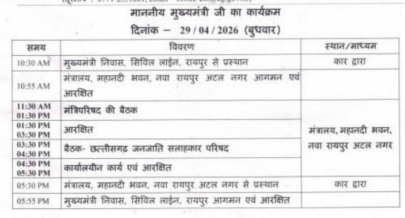 Today’s schedule of HCM April 29, 2026April 29, 2026Roytars News Raipur 29 April. Today’s schedule of HCM.